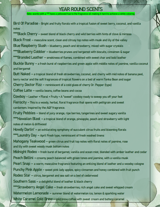 Please note scents with ** have a slight yellow hue making it difficult to achieve bright white coloring