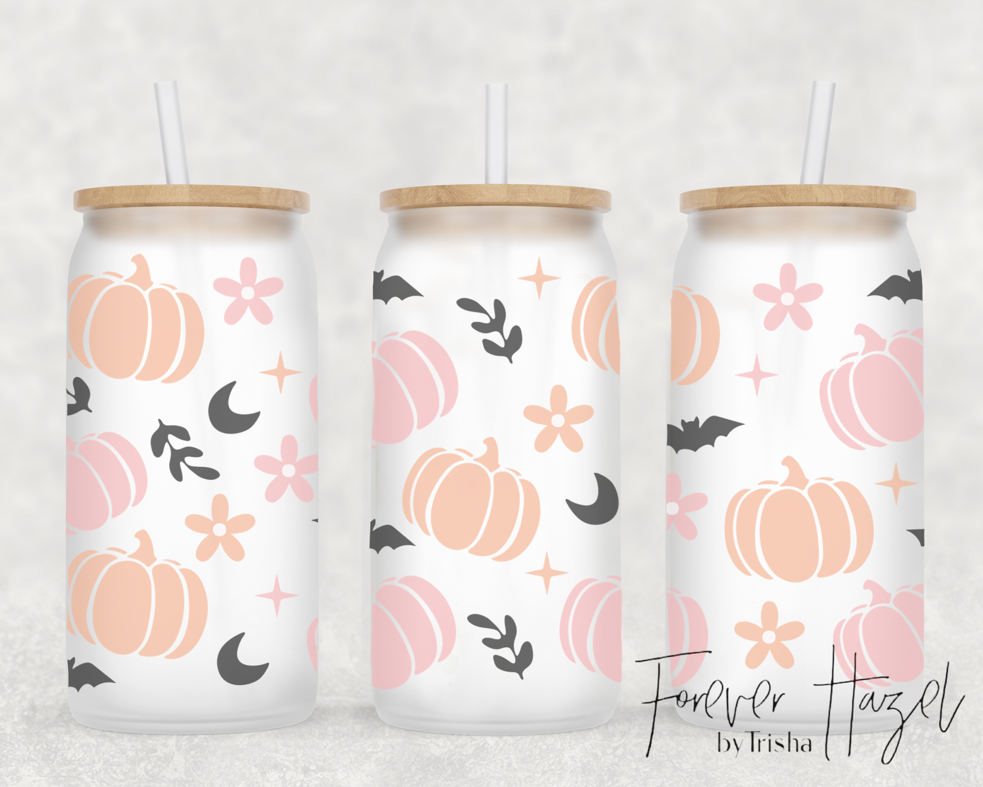 Bats, Flowers & Pumpkins 16oz Frosted Glass Can