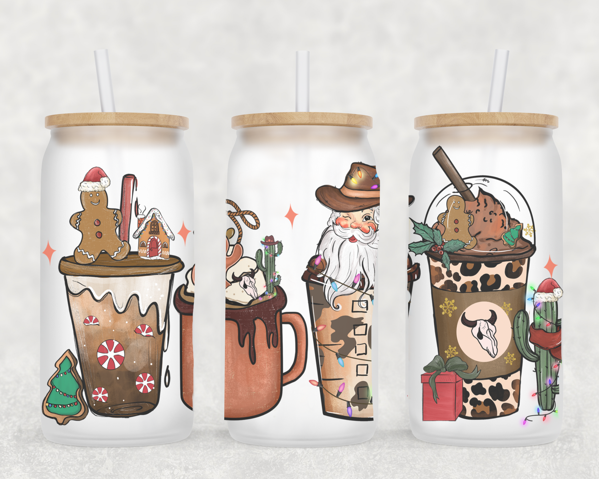 Cowboy Christmas Coffee Cups 16oz Frosted Glass Can