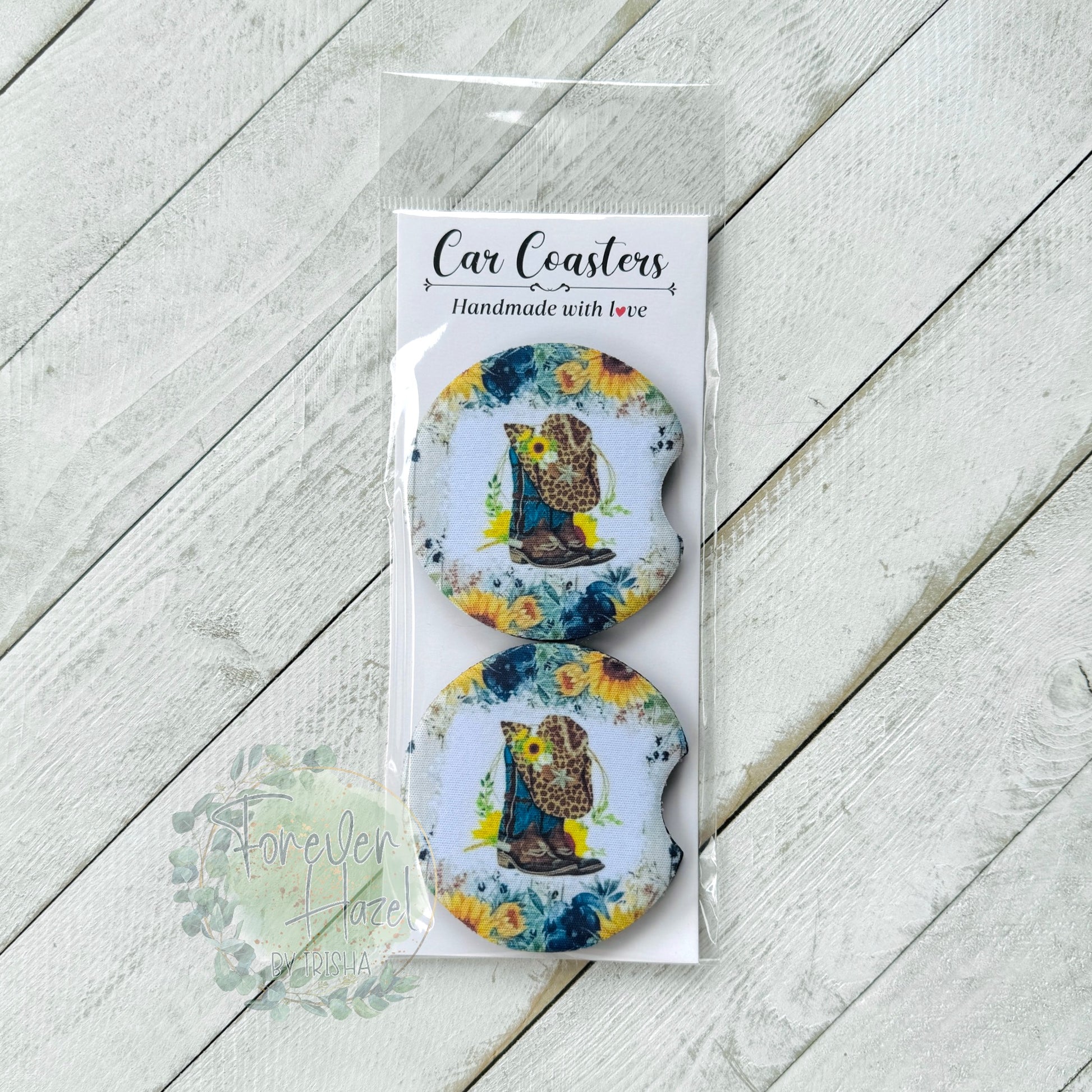 Tired of having the condensation that has pooled at the bottom of your car's cup holder drip on you? If so, you need some car coasters! These fun car accessories will keep your cup holder dry and are sure to get PLENTY of compliments! They are 2.75" neoprene rounds with a notch to make removal easy.