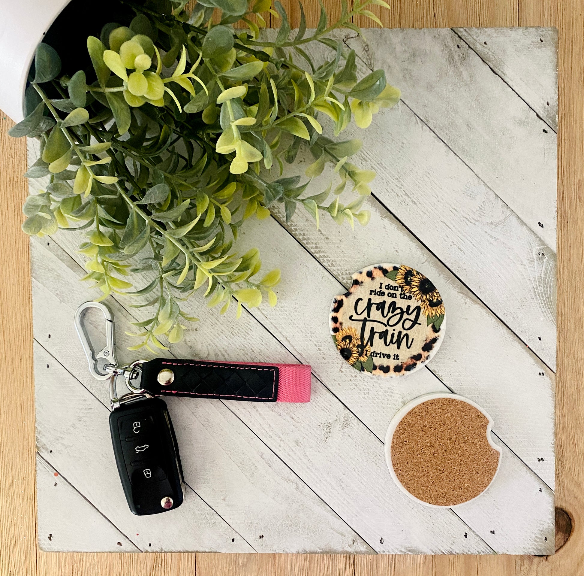 Tired of having the condensation that has pooled at the bottom of your car's cup holder drip on you? If so, you need some car coasters! These fun car accessories will keep your cup holder dry and are sure to get PLENTY of compliments! They are 2.75" ceramic rounds with a notch to make removal easy. Include a cork backing.