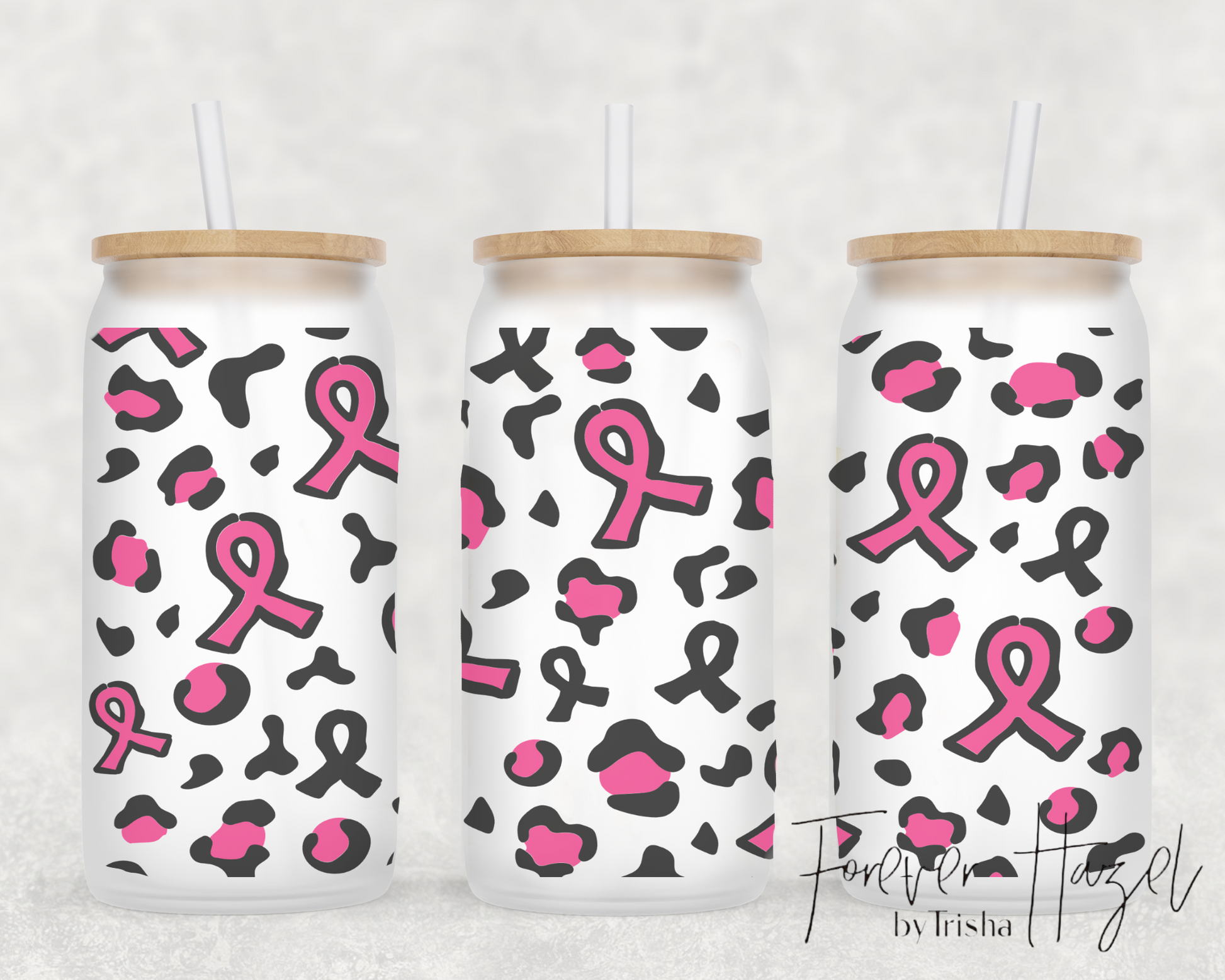 Pink Ribbons & Cheetah 16oz Frosted Glass Can