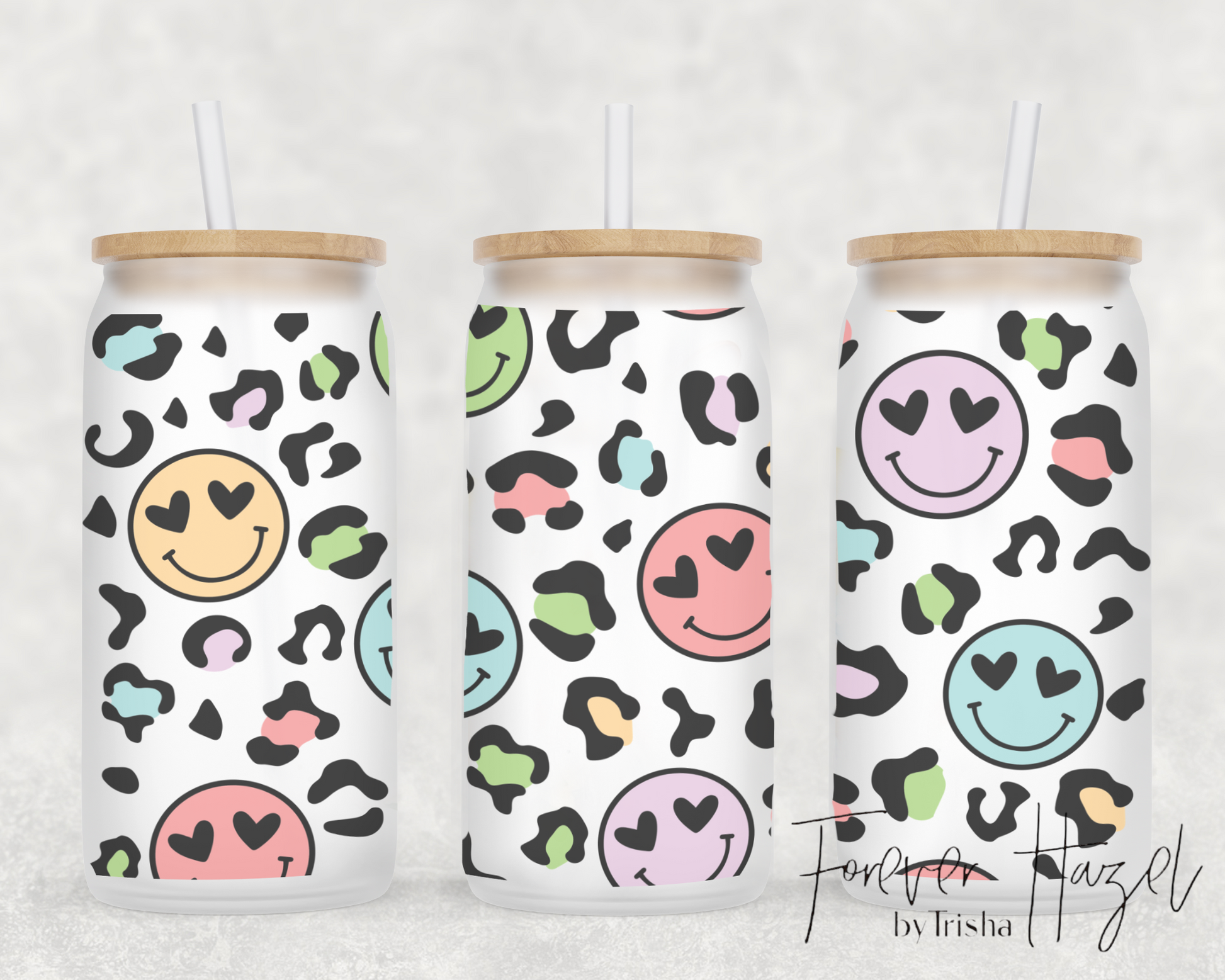 Rainbow Smileys & Cheetah 16oz Frosted Glass Can