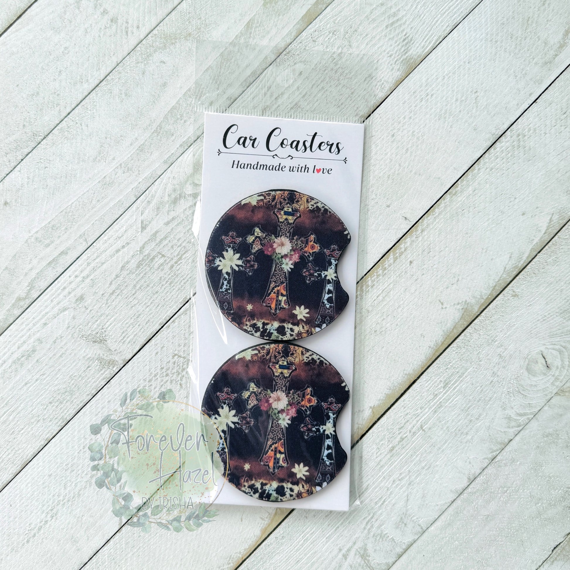 Tired of having the condensation that has pooled at the bottom of your car's cup holder drip on you? If so, you need some car coasters! These fun car accessories will keep your cup holder dry and are sure to get PLENTY of compliments! They are 2.75" neoprene rounds with a notch to make removal easy.